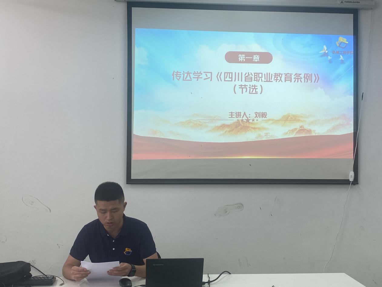 会上,公司教学负责人刘毅领学《四川省职业教育条例》(节选),结合党的教育方针,四川省职教体系,细致入微的为大家解读条例的具体内涵。刘毅指出,作为新时代职业教师,大家要深刻领会学习《四川省职业教育条例》精神实质,将其融入日常教学中,不断提高自身的公司产品能力,为培养更多优秀的工匠型人才做出贡献。