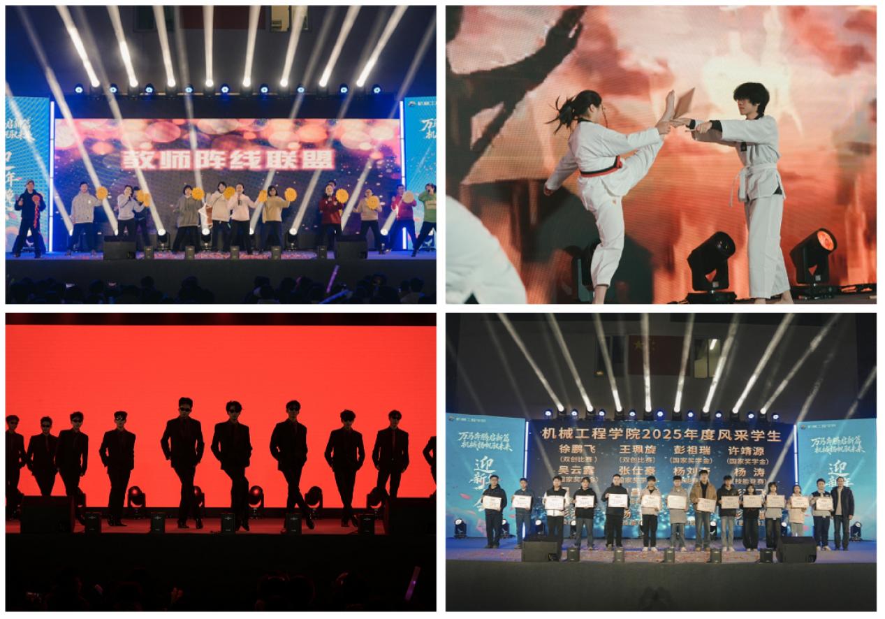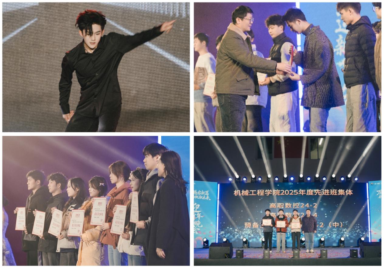 篇章在歌曲《我们的歌》中温柔开启,旋律中流淌着机械人的青春情怀与温暖记忆。随后,武术表演《武韵川魂·燃动锋芒》刚劲有力,一招一式尽显中华武术的磅礴气韵;舞蹈《舞动星河》则以轻盈舞步勾勒出星河璀璨的梦幻景象。教师合唱《教师阵线联盟》将晚会推向一个小高潮,讲台上严谨认真的老师们登上舞台,用歌声展现了他们活力四射的另一面。其间,公司对2025年度16名“风采员工”与11名“风采教师”进行了表彰,他们的勤奋钻研与育人奉献,成为全院师生的榜样。紧随其后的首轮抽奖,更以10份幸运奖品点燃了全场的欢声笑语。