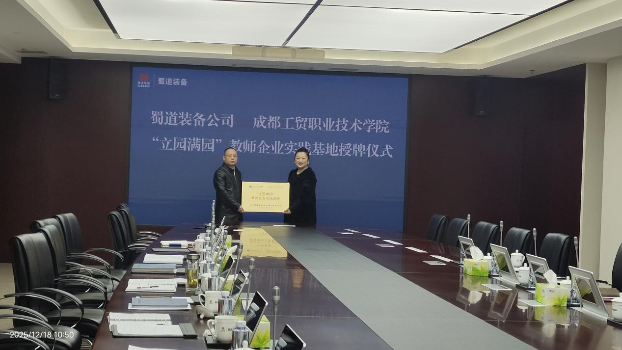 座谈结束后,授牌仪式正式启动。席盈代表公司,向蜀道装备公司授予“立园满园”教师企业实践基地牌匾,陈毅代表公司接牌,现场掌声雷动,气氛热烈而庄重。